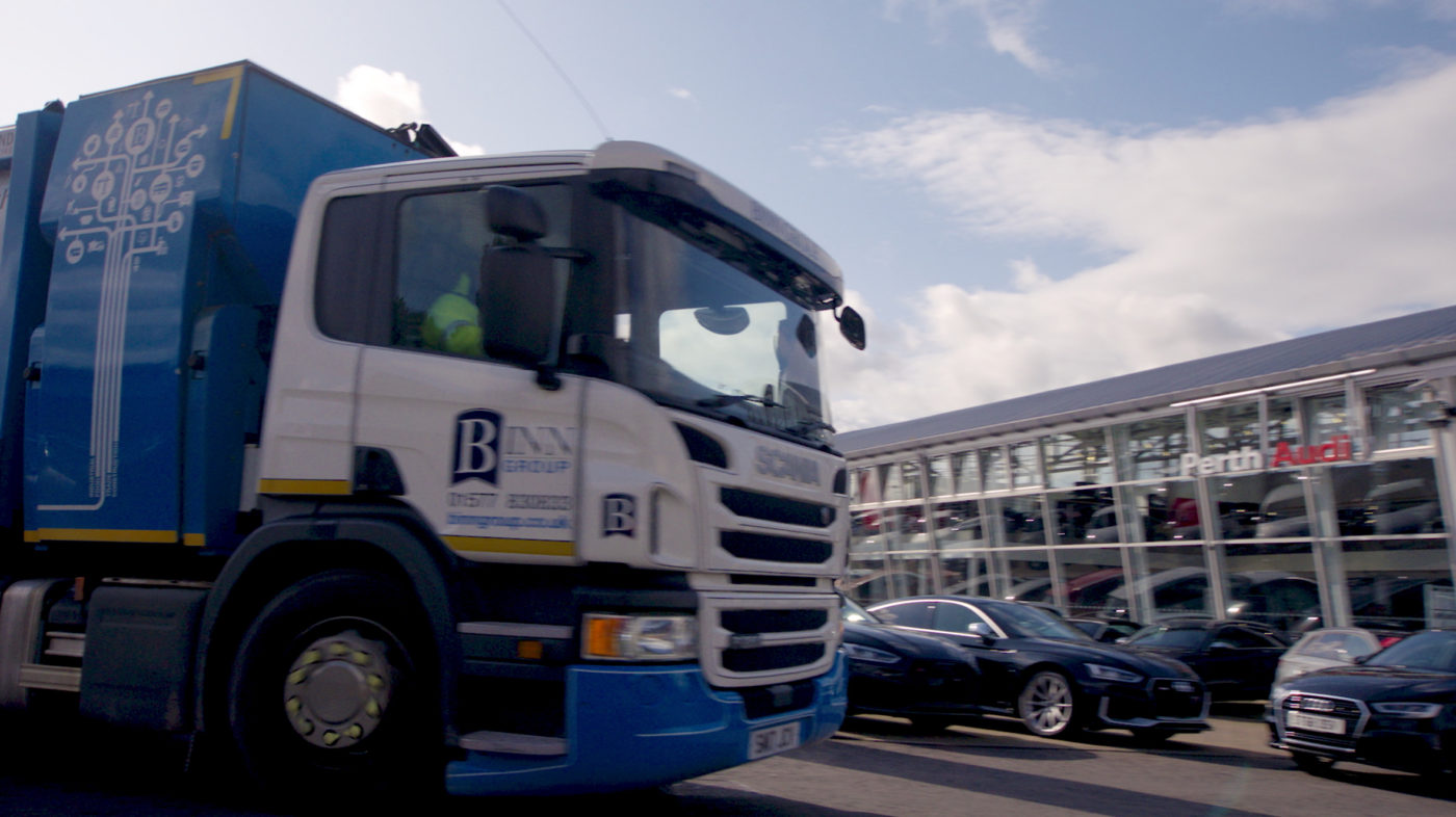 Servicing the company’s Cameron VW, Cameron Audi and Strathmore Volvo dealership sites on Perth’s Dunkeld Road “Motor Mile”, presents a challenging mixture of routine and unusual waste products for Binn Group. These materials include scrap metal; “hazardous” waste such as aerosols, oily rags, brake fluid, general cardboard, paper, cans, plastics and residual waste.